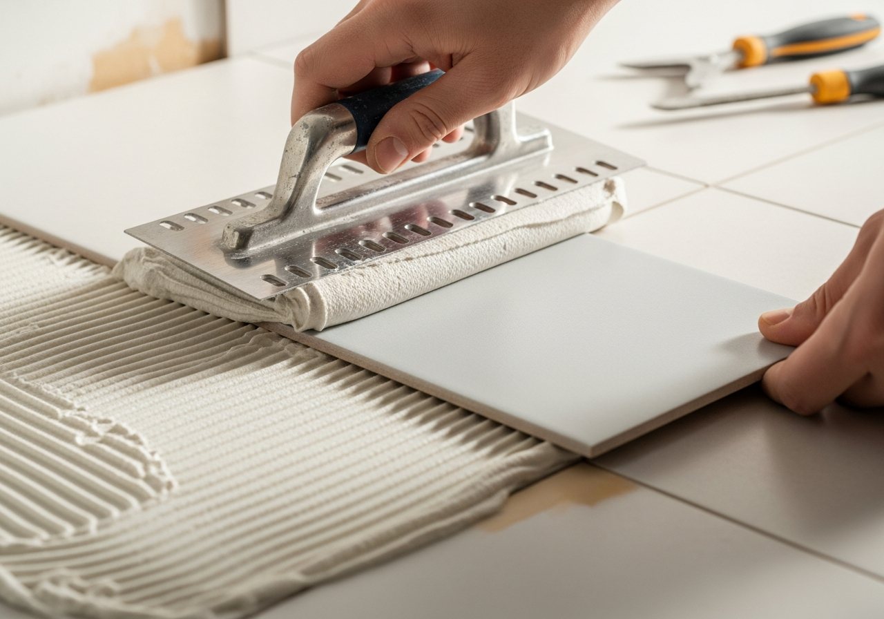 Klej nakładaj na małe fragmenty powierzchni starych płytek, żeby nie wysychał zbyt szybko. Użyj zębatej pacy, trzymając ją pod kątem około 45–60 stopni, żeby stworzyć równomierne rowki. Paca z zębami świetnie rozprowadza klej i do tego eliminuje puste przestrzenie pod płytką – to super ważne!