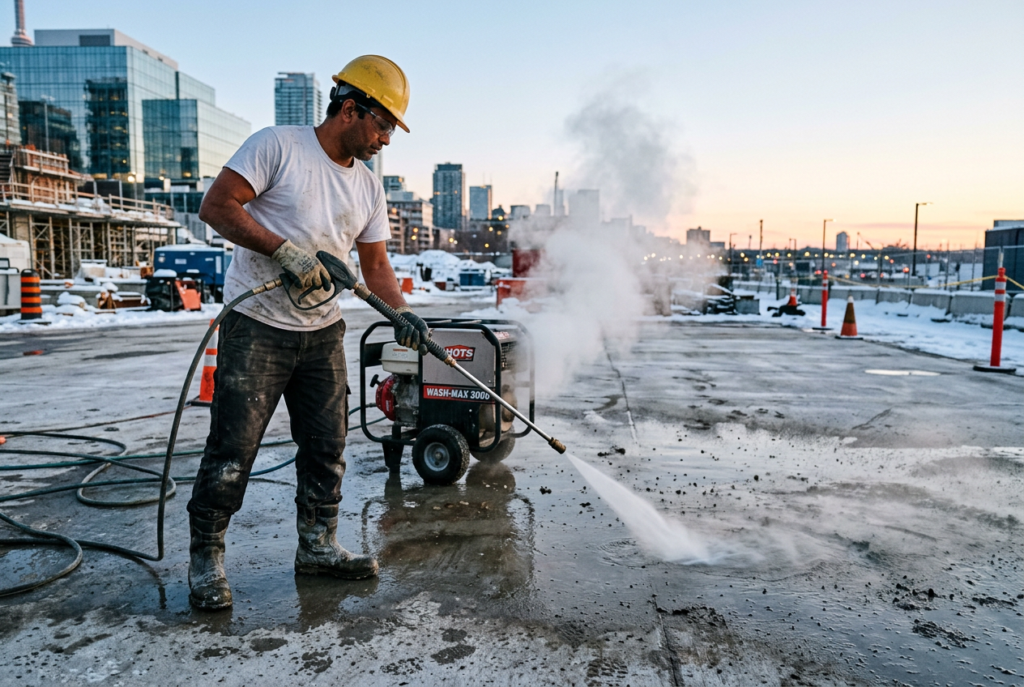 - Mycie rusztowań i deskowań przed ponownym użyciem – elementy szalunkowe pokryte resztkami betonu wymagają dokładnego oczyszczenia, aby zapewnić gładką powierzchnię przy kolejnym użyciu